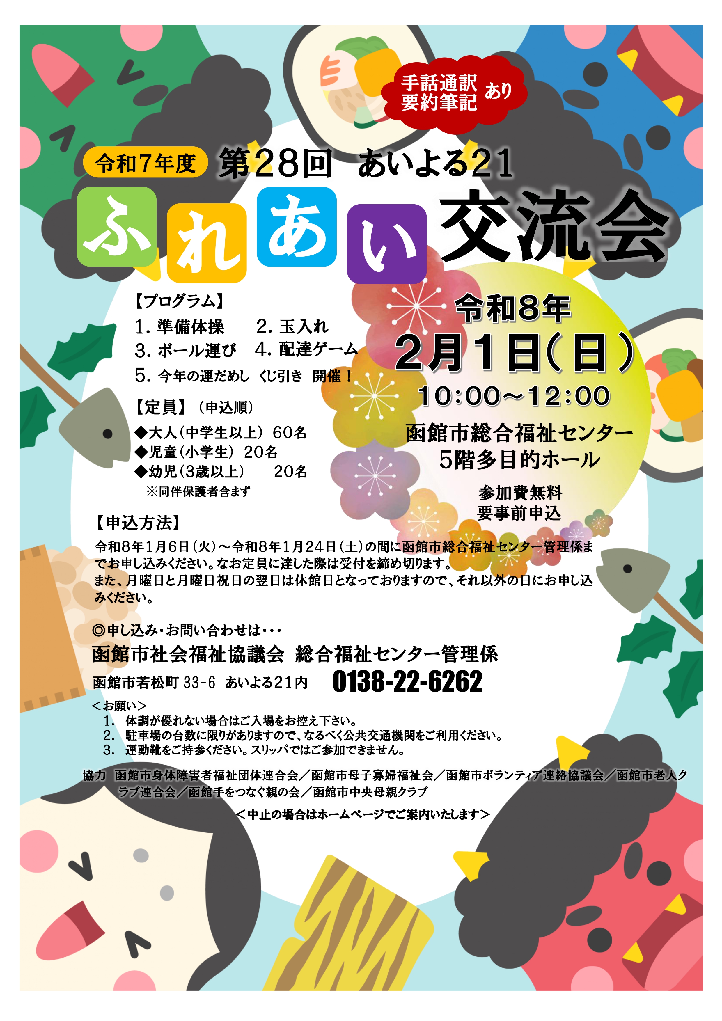令和8年2月1日(日)午前10時より、総合福祉センター5階多目的ホールにて、「第28回あいよる21ふれあい交流会」を開催いたします。