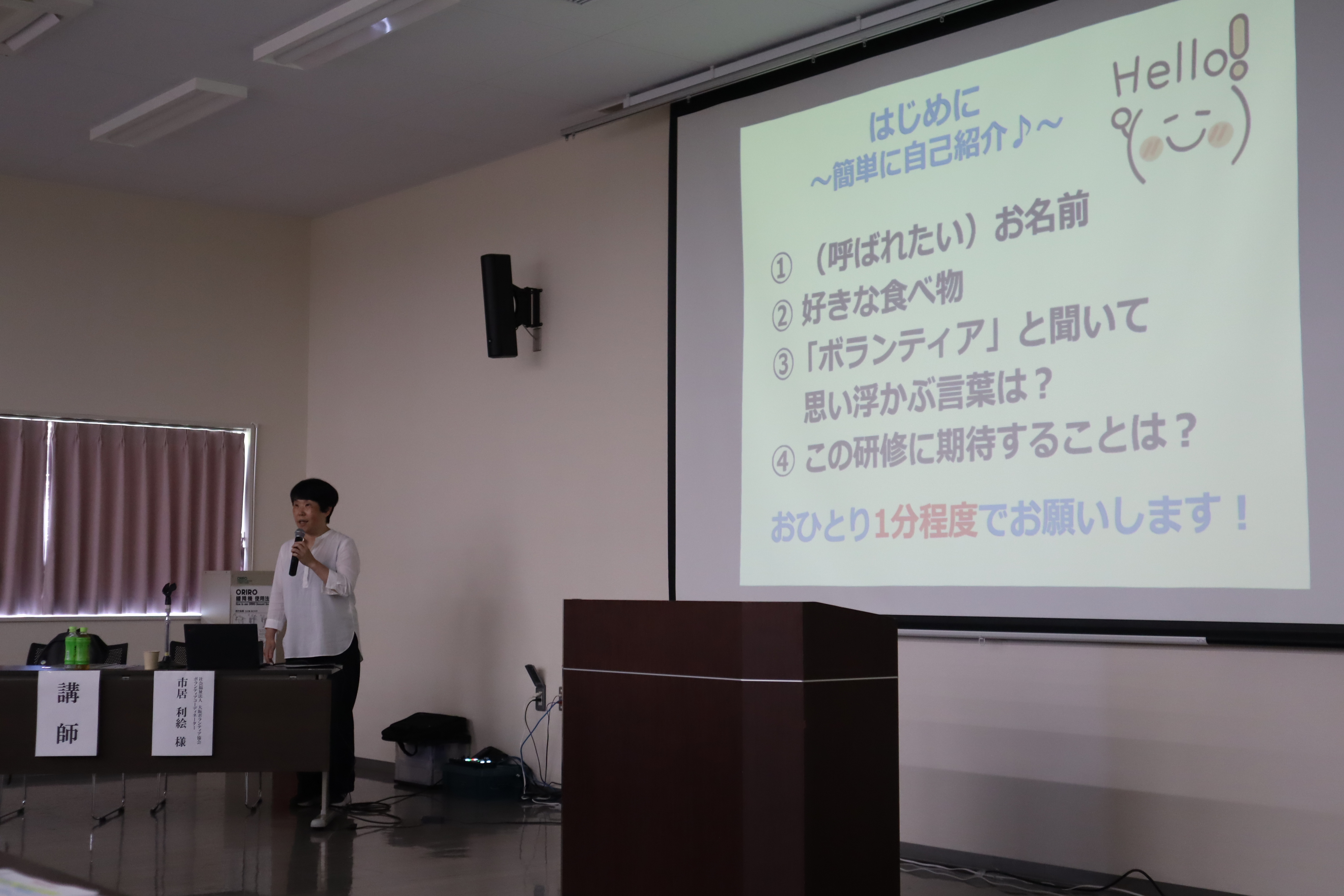 第1回目となる入門編では、社会福祉法人 大阪ボランティア協会 市居 利絵 様を講師に迎え、「ボランティア入門―ボランティアを楽しもうー」と題した講演を行っていただきました。